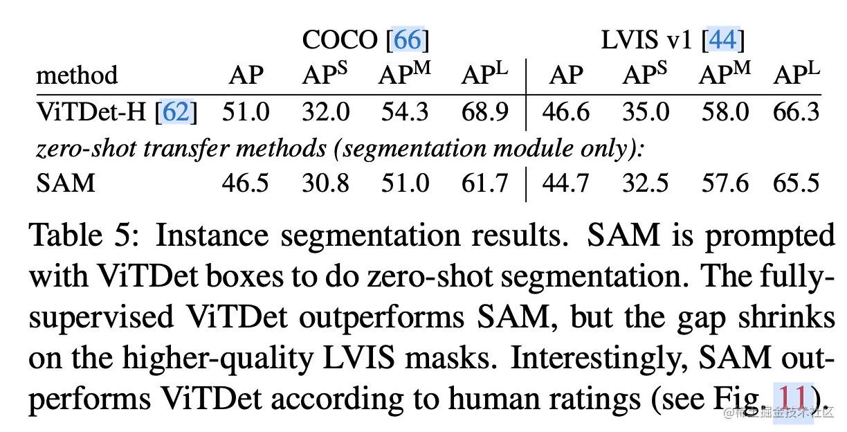 先用一个目标检测算法,用目标检测得到的box作为prompt输入到SAM,就可以做实例分割了。实验的结果分为了定量(用测试集的GT)和定性(人来评判好坏)两种。定量的指标不如BiTDet—H,定性的指标SAM优于ViTDet。作者给出的解释是COCO数据集标注效果一般(在人看来甚至不如SAM和ViTDet模型输出的结果),因此ViTDet在COCO上做训练时拟合到了一些错误的偏差,但错误的偏差和标注相似,因此定量的指标不如ViTDet