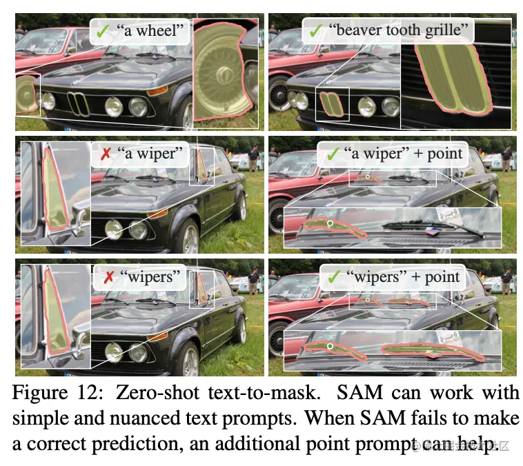 这里指的是用文本作为prompt,然后分割出文本提到的目标。作者在训练的时候取的是图片中目标尺寸大于100*100的目标,用CLIP提取image embedding(text embedding也行,因为CLIP的image embedding和text embedding是对齐的),作为prompt encoder模块的输出,用于训练SAM模型。这一部分没有和其他方法对比,也由于效果不太稳定,在官方的demo中没有展示