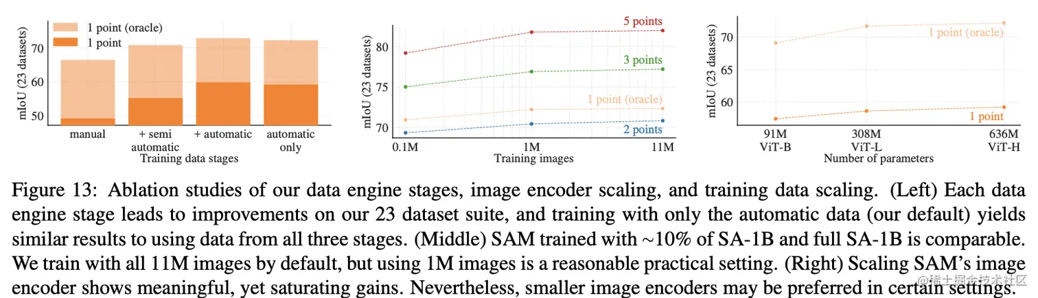 辅助标注: 简单来说就是用可以获取到的开源分割数据训练一个初始的SAM模型V0版本,再用V0在没有分割标注的数据上生成预标注,人工check模型的结果并作修改和确认。得到新的数据后,再将新的数据加入到训练集重新训练SAM得到V1版本,再循环标注数据和迭代模型。总共进行6次训练。开始的时候数据集比较少,使用的ViT-B模型,最终会使用ViT-H模型。 这里面还有一些效率提升的数据,例如随着模型的迭代,每个mask的标注耗时从34s到14s。SAM模型在每张图片上生成的mask从20到44个。在该阶段数据集最终有12万张图片,430万个mask