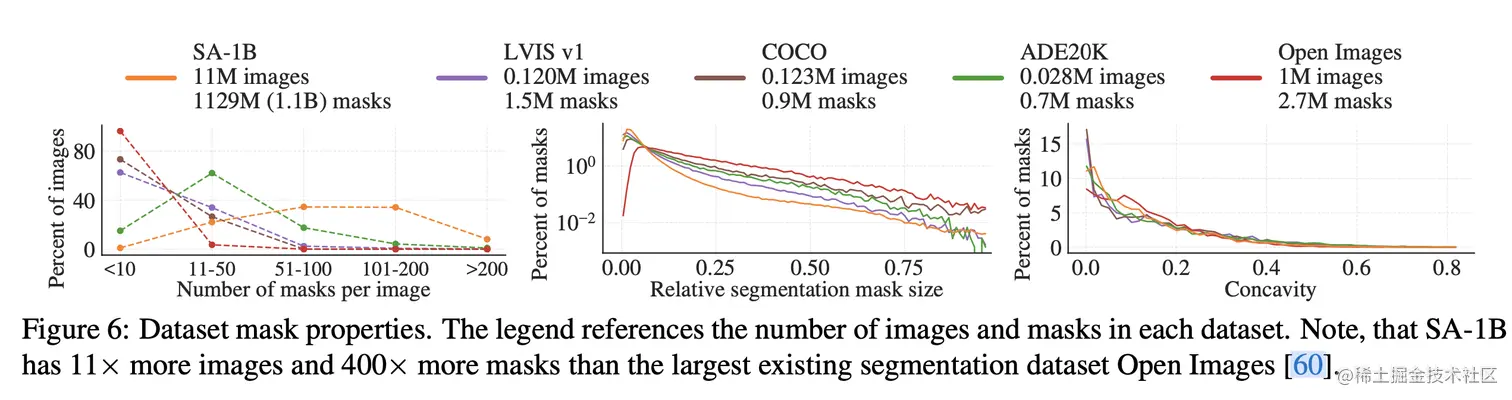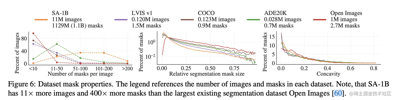 下面也从mask的数量,每种mask尺寸的占比和mask占外接矩形比例等多方面和其他数据集做了对比