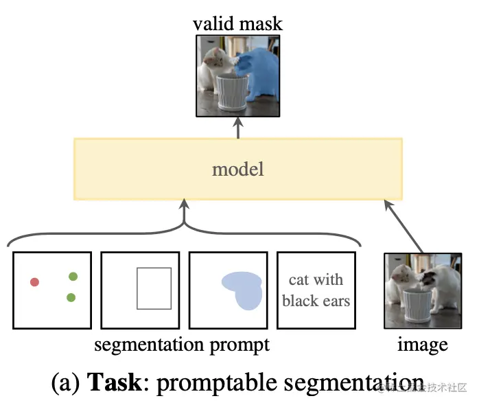 任务的设计灵感来自于NLP领域,例如NLP中可以通过预测next token作为预训练任务,而在下游任务中可以使用prompt engineering做应用。因此,为了建立分割的基础模型,任务的设计目标是也需要具有类似的能力。 这里作者扩展了下NLP里prompt在图像分割里的用法, prompt可以是以下几种类型: