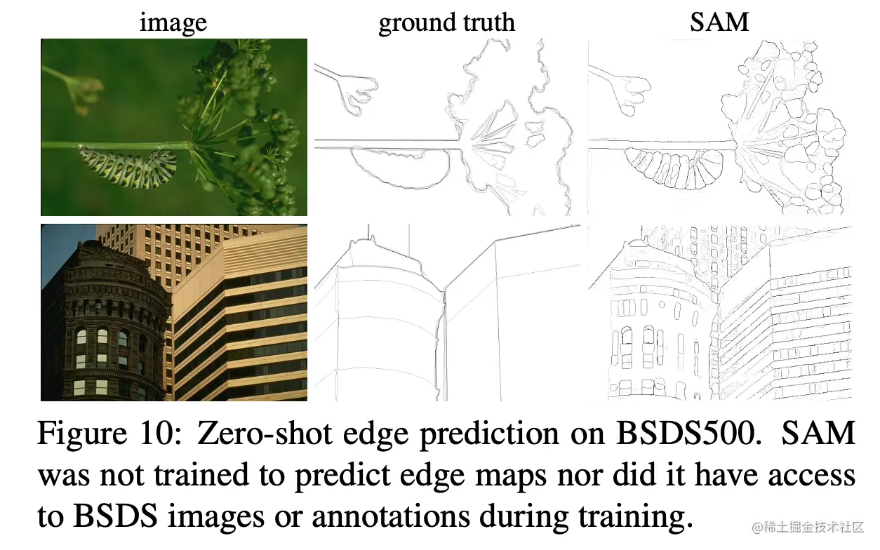 SAM在训练的时候就是采用的包含point prompt的方式,作者这里还对比了一些在训练时没有包含的方式,边界检测就是其中一种。SAM在使用边界检测时,使用方式是在图片上铺上16*16均匀的point prompt,每个prompt产生3个mask,再经过NMS后。通过Sobel filtering得到边缘检测的结果。SAM的结果倾向于提取更丰富的边缘,因此在指标上recall和专门做边缘检测的模型相当,precision会低些。