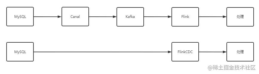 通过下图,我们可以看到Canal处理数据的链路比FlinkCDC更长,数据链路一旦变长意味着,出错的可能性更高。