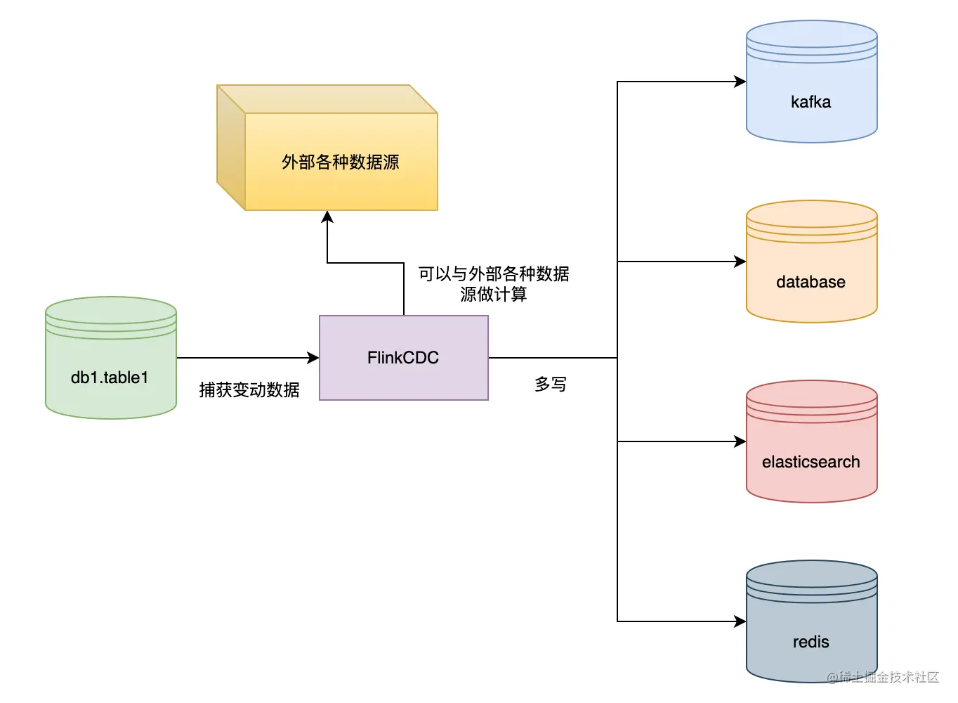 基于以上问题,本场数据同步的主角FlinkCDC就登场了,FlinkCDC是专门为数据同步(同步+计算)而生。通过CDC工具,可以将数据同步任务从业务系统中解耦出来,同时还可以将一份变动的数据,写入到多个存储中。这种方式不但让业务系统解耦,而且可以让数据同步任务更加健壮,方便后续的维护。