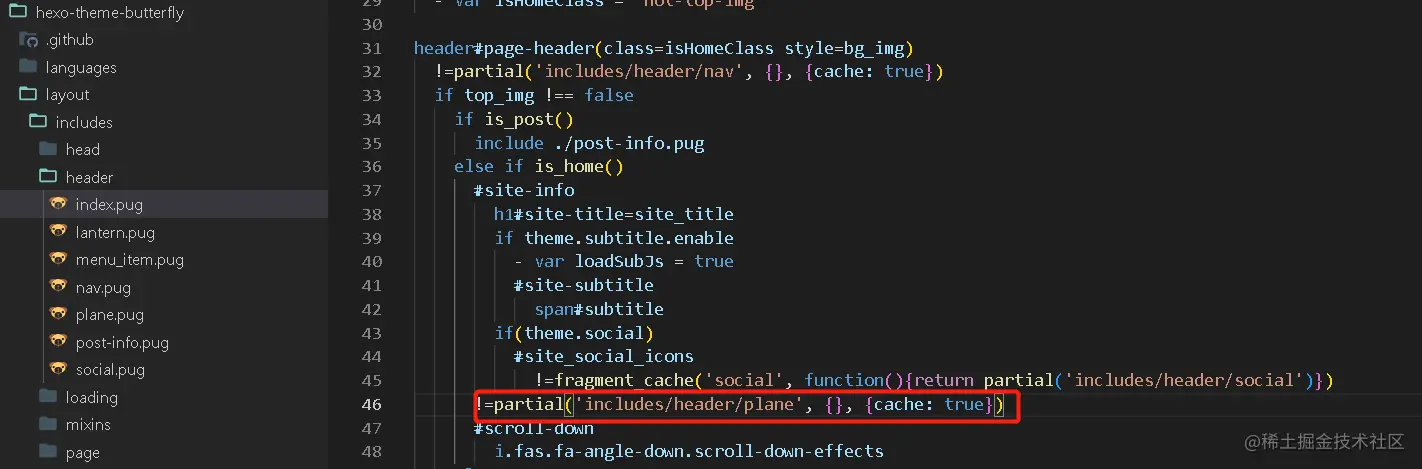 BlogRoot/themes/butterfly/layout/includes/header/index.pug中引入上一步中创建的plane.pug文件。