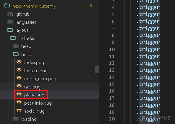 BlogRoot/themes/butterfly/layout/includes/header文件夹下新建一个plane.pug文件。 具体位置如下图:将以下代码复制到文件中。