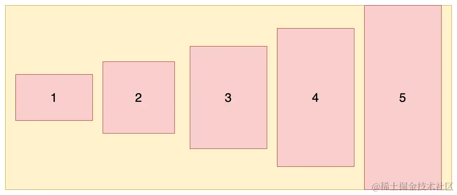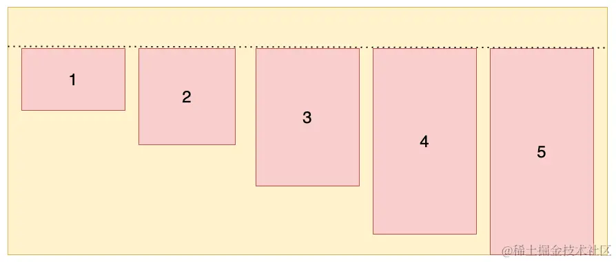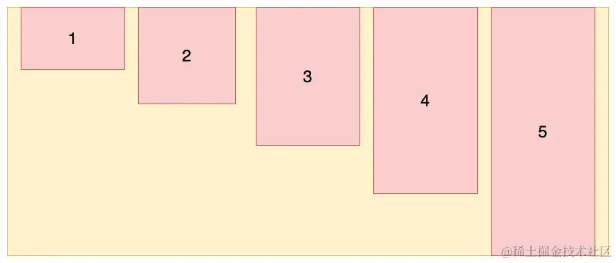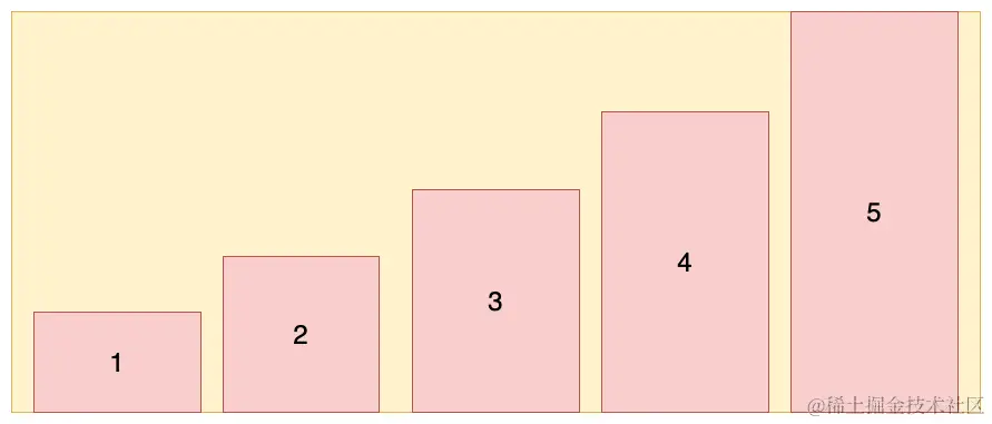 (1)flex-start: 交叉轴的起点对齐(上面或左边)。设置容器高度为 100px,项目高度分别为 20px、40px、60px、80px、100px,效果如图所示: