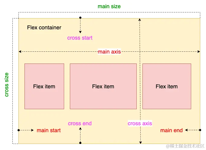 项目默认沿主轴排列。单个项目占据的主轴空间叫做main size,占据的交叉轴空间叫做cross size。