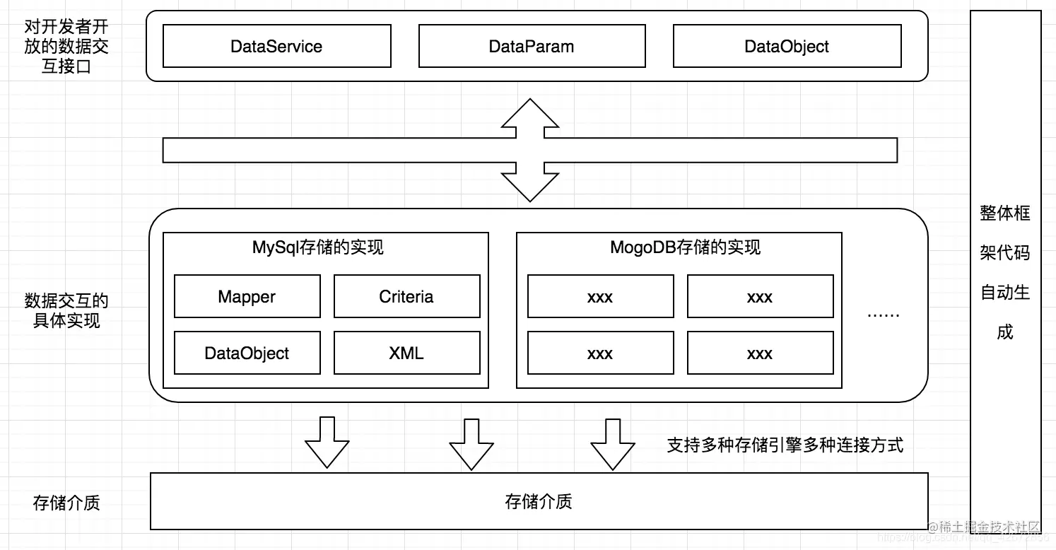 1)对开发者开放的这一层,由DataService、DataParam、DataObject组成,开发者只需要关心业务逻辑对应的语义条件,将语义条件传达给DataParam,整个传达的过程非常简单,像构造一个简单的POJO一样简单。然后通过DataService就可以完成各种存储操作了。具体底层是怎么使用语义条件的,开发者无需关心。