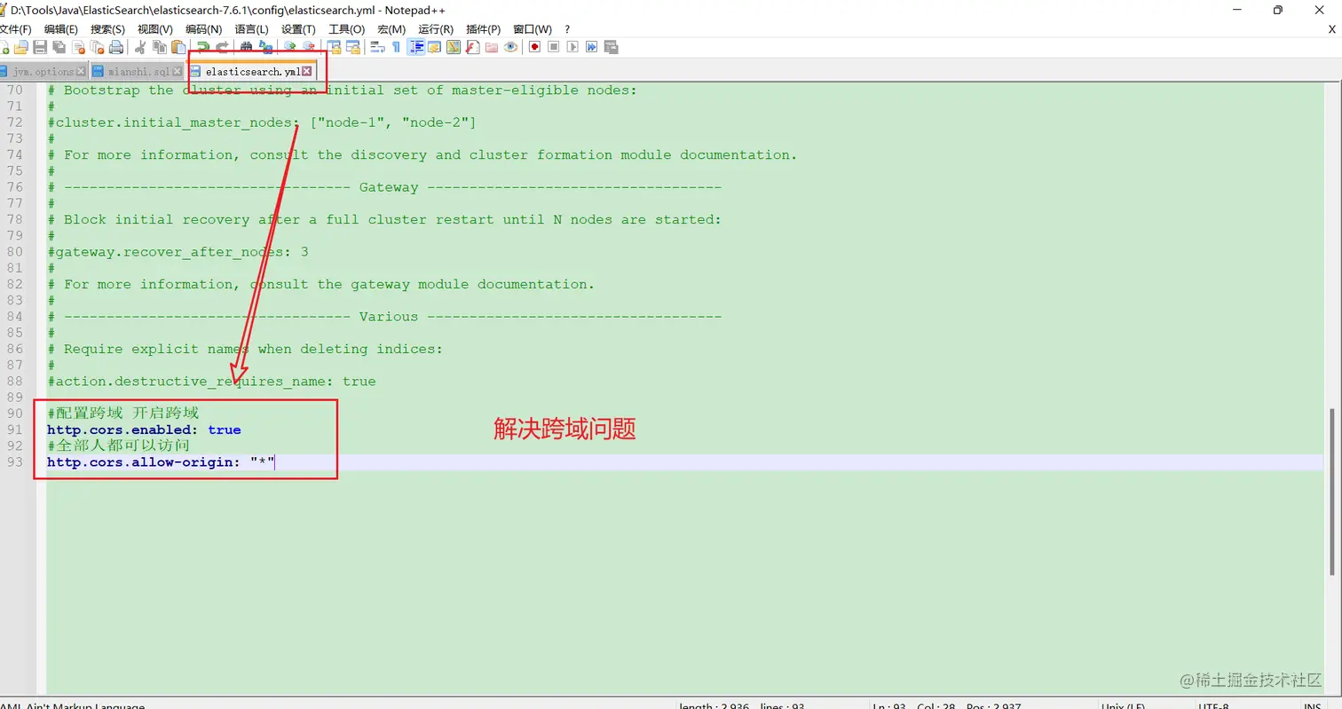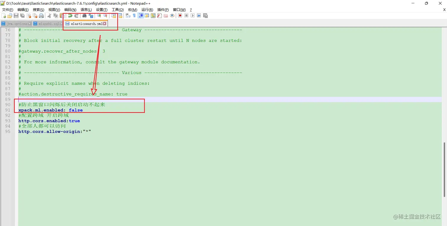 修改config/elasticsearch.yml文件, 添加如下内容: