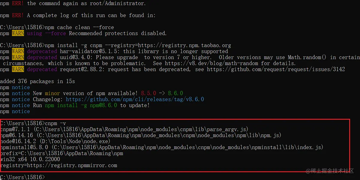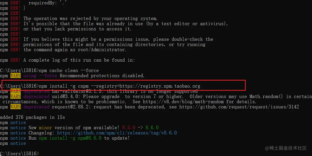 执行成功后会出现npm WARN using --force I sure hope you know what you are doing