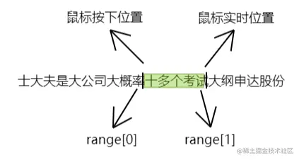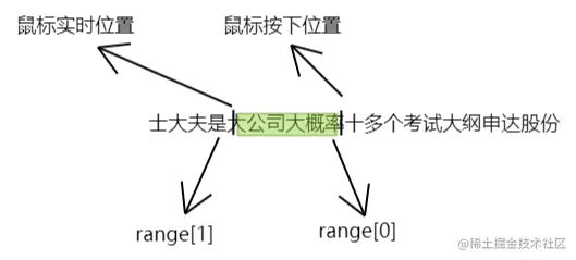 如下图,如果鼠标实时位置在鼠标按下位置的后面,那么按下位置的元素实际上是不包含在选区内的: