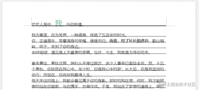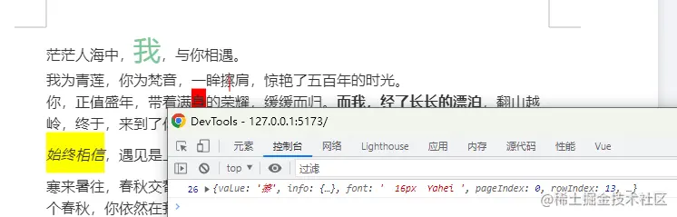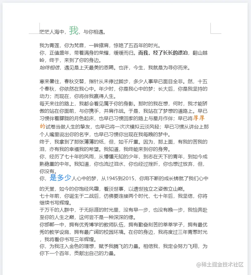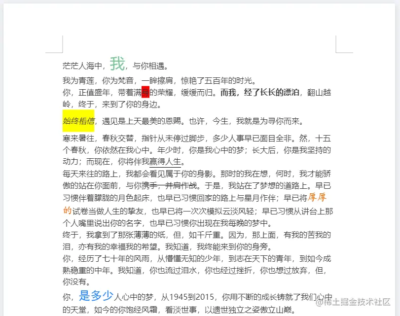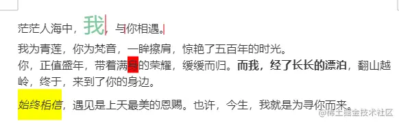 到这里我们实现了一个类似Word的富文本编辑器,支持文字的编辑,支持有限的文字样式,支持光标,支持选区,当然,这是最基本最基本的功能,随便想想就知道还有很多功能没实现,比如复制、粘贴、方向键切换光标位置、拖拽选区到其他位置、前进后退等,以及支持图片、表格、链接、代码块等文本之外的元素,所以想要实现一个完整可用的富文本是非常复杂的,要考虑的问题非常多。