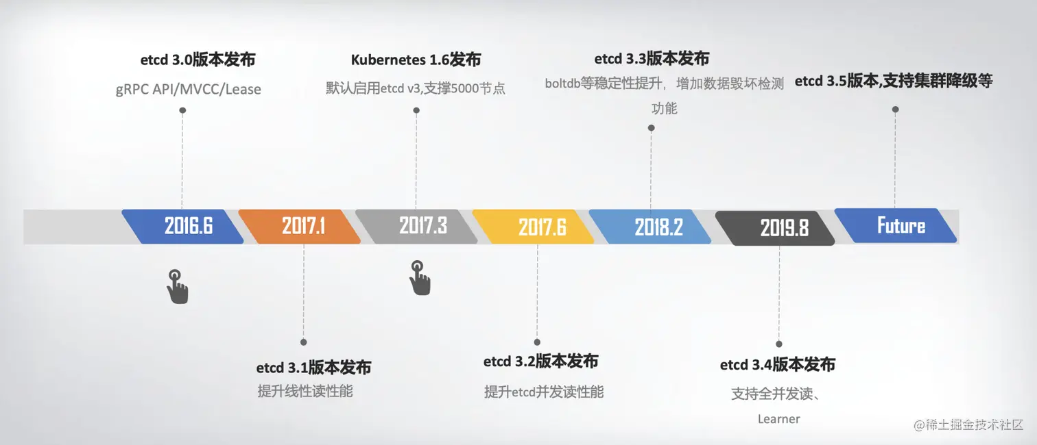 2016年6月,etcd 3.0诞生,随后Kubernetes 1.6发布,默认启用etcd v3,助力Kubernetes支撑5000节点集群规模。