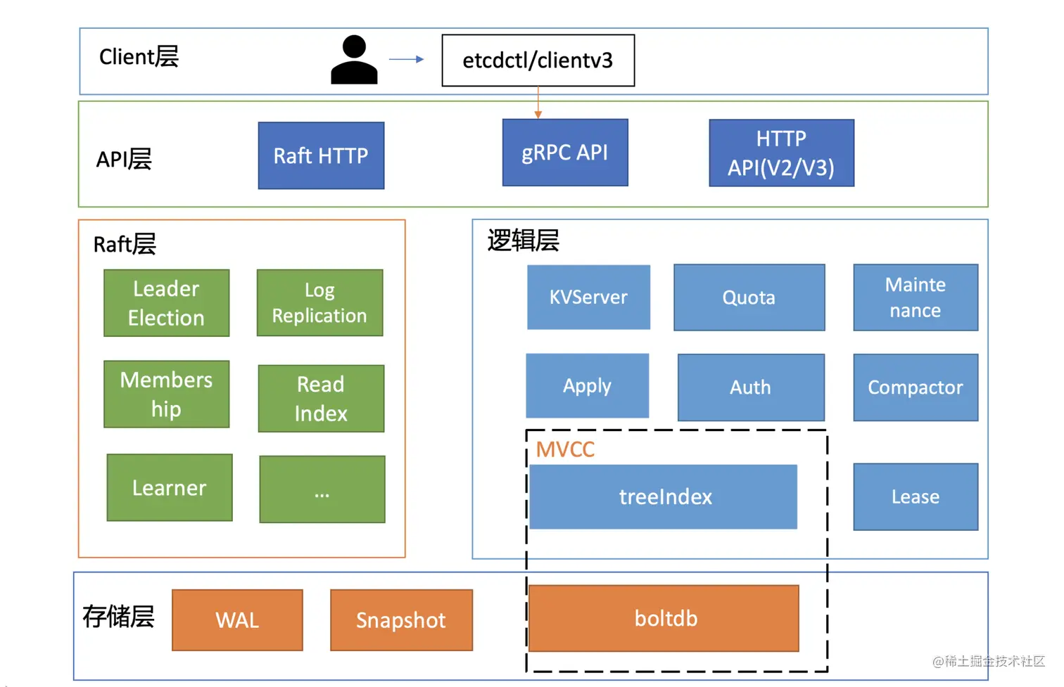 你可以看到,按照分层模型,etcd可分为Client层、API网络层、Raft算法层、逻辑层和存储层。这些层的功能如下: