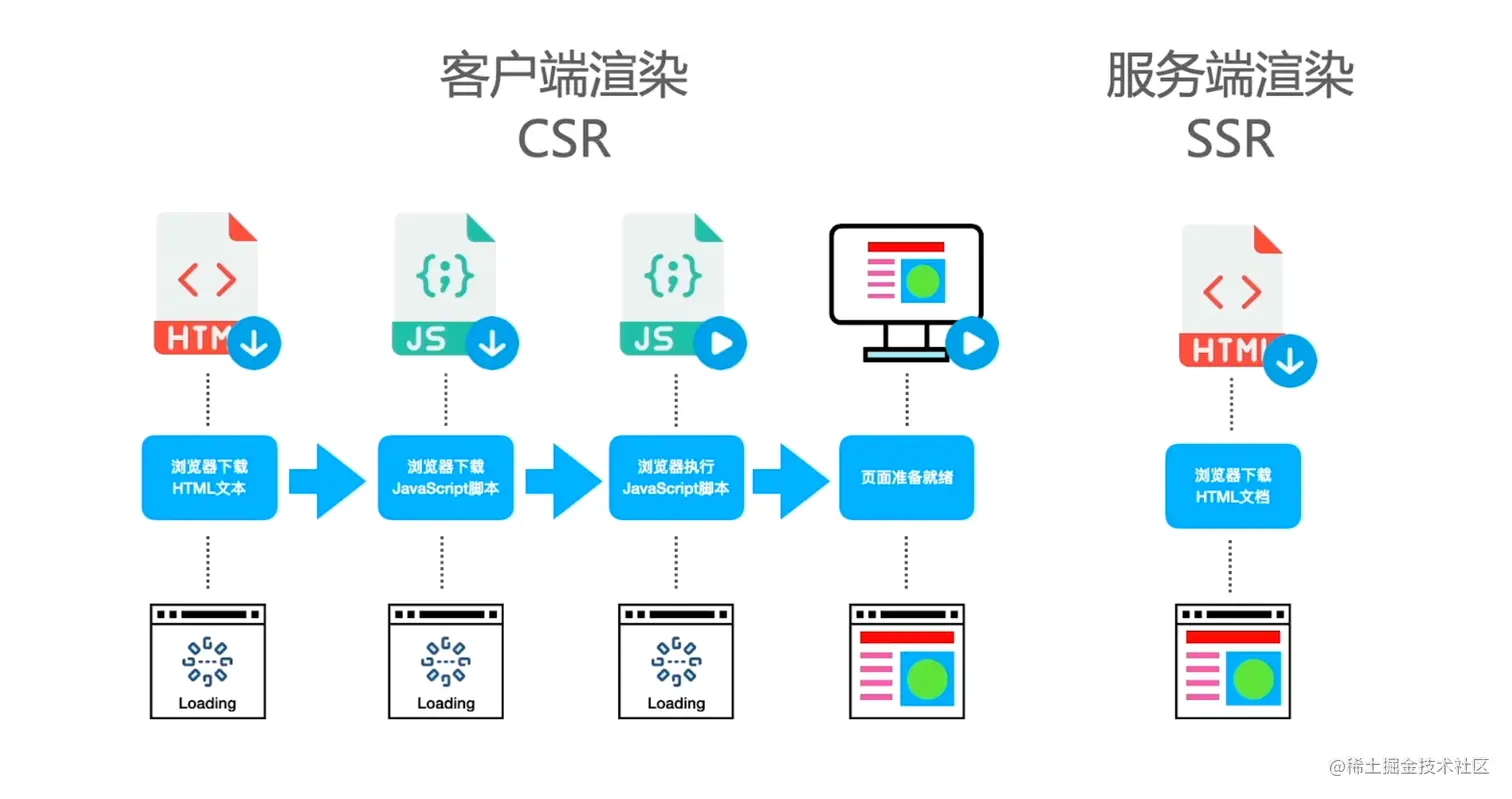 浏览器从服务端请求网页,会下载 CSS、JavaScript 资源,并渲染从服务端发送过来的 HTML。当我们点击链接切换路由时,会整页刷新,这些请求都会重新执行。