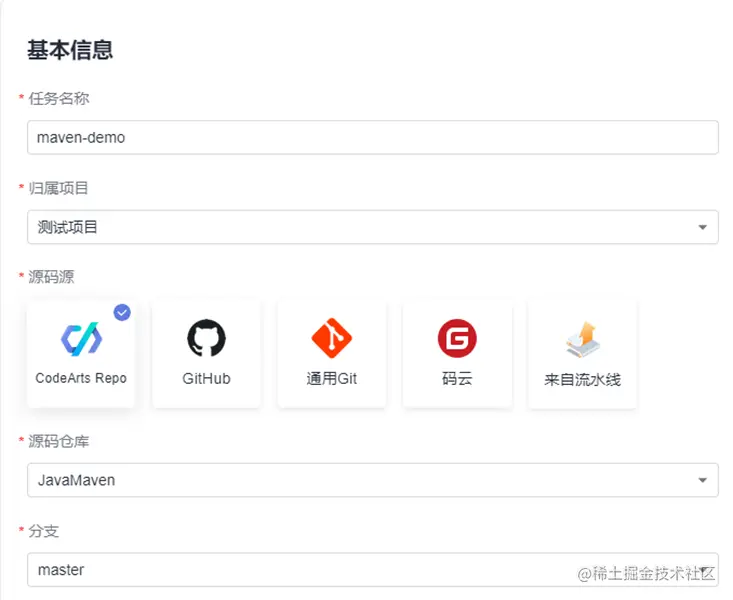 - 设置任务名称,选择源码源(“源码源”选择“CodeArts Repo”,“源码仓库”选择已创建的代码仓库,“分支”默认选择“master”),并根据需要添加任务描述,然后单击“下一步”。