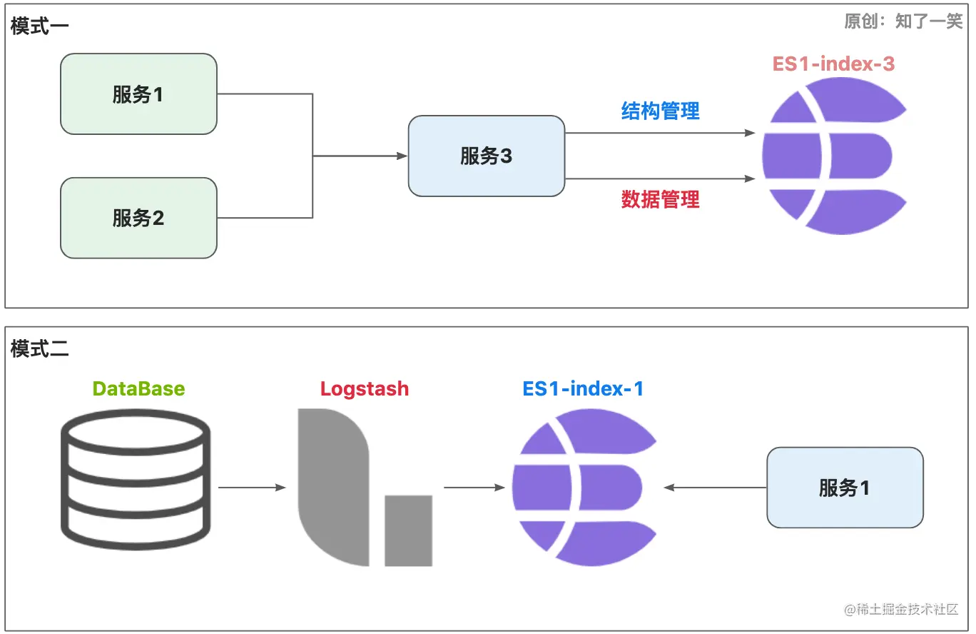 无论是模式一还是模式二,都是ES常用的集成策略,比如模式一对于核心数据模型的构建,常见于订单或商品等,模式二的经典用法之一ELK日志采集等;