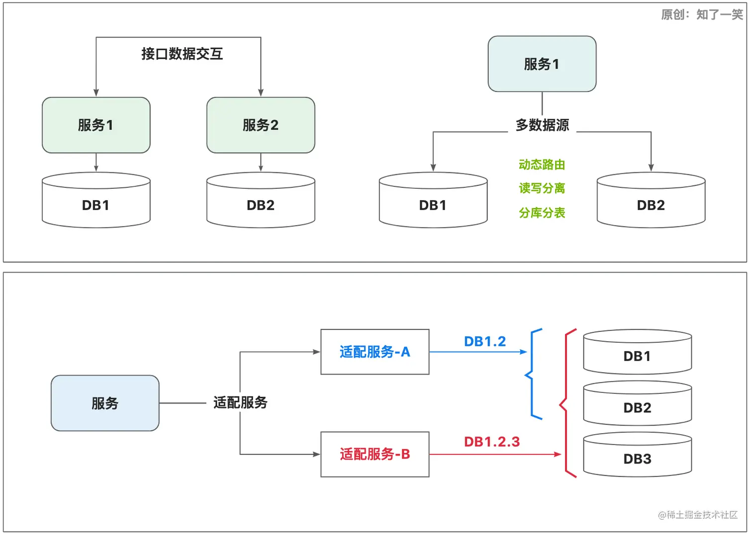 在常规的微服务工程中,通常每个服务都会使用各自独立的数据库,在多数据源的集成模式中,常用的逻辑就是动态路由、读写分离、分库分表等,如果逻辑简单可以自定义封装,如果逻辑复杂可以使用成熟的组件;