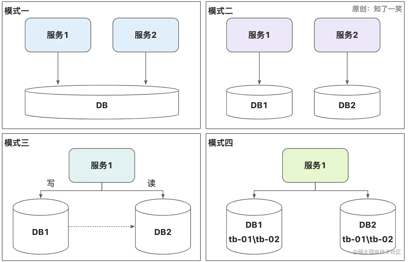 多数据源模式:在一个服务内集成多个数据源,像模式三读写分离和模式四分库分表,这是偏数据服务的业务场景中经常使用的模式;