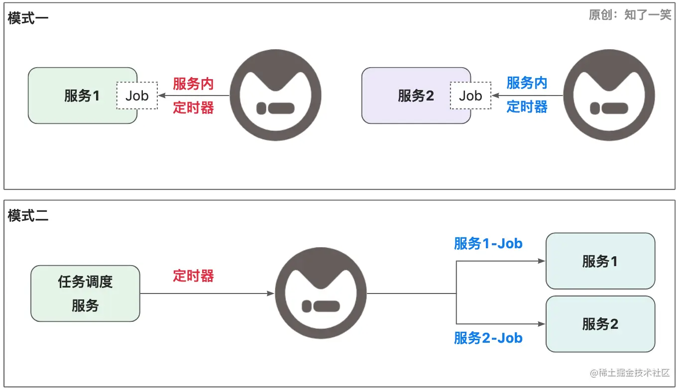 通常模式一只会在个别独立的服务中采用,对于模式二来说,封装独立的任务调度服务,可以统一与其他服务进行集成或者通信,比如通过消息服务及时通知失败的任务等;