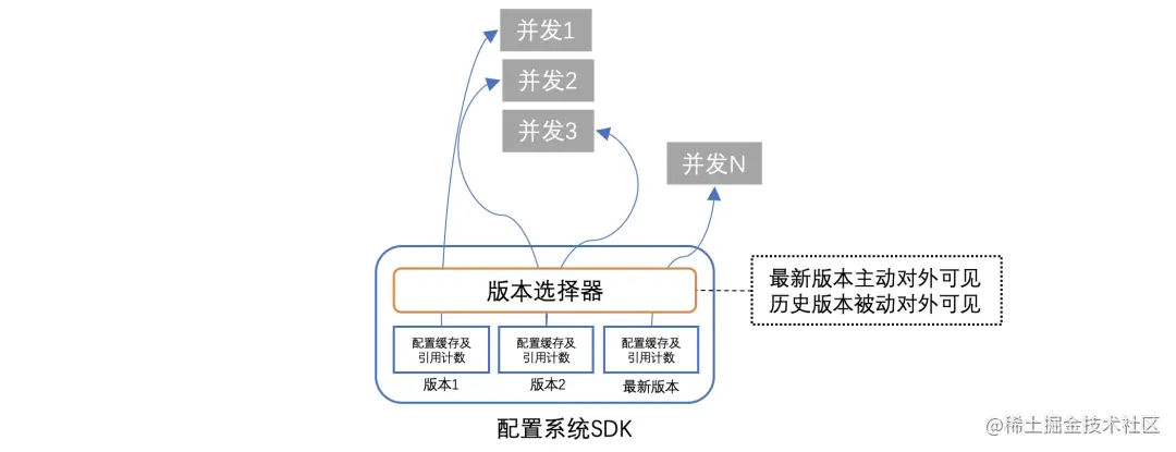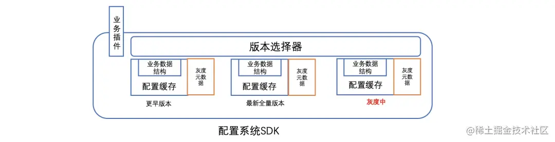 在配置 SDK 多版本能力的基础上,实现灰度发布的能力是轻而易举的。灰度发布的能力,不过就是选择生效配置版本的能力,如果本机、本角色、本请求业务 Key(如用户、商户、订单)等命中灰度范围,则使用新版本,否则使用原版本。