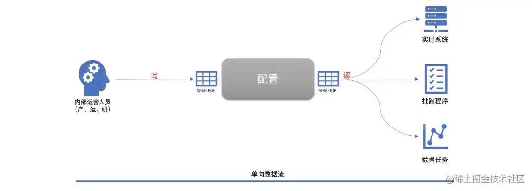 因此,本文所指的配置特指内部运营人员产生的数据(广义的系统运营人员,包括产品、运营、研发等),作为输入参数而作用于编程系统(包括实时系统、批跑程序以及数据任务等)。