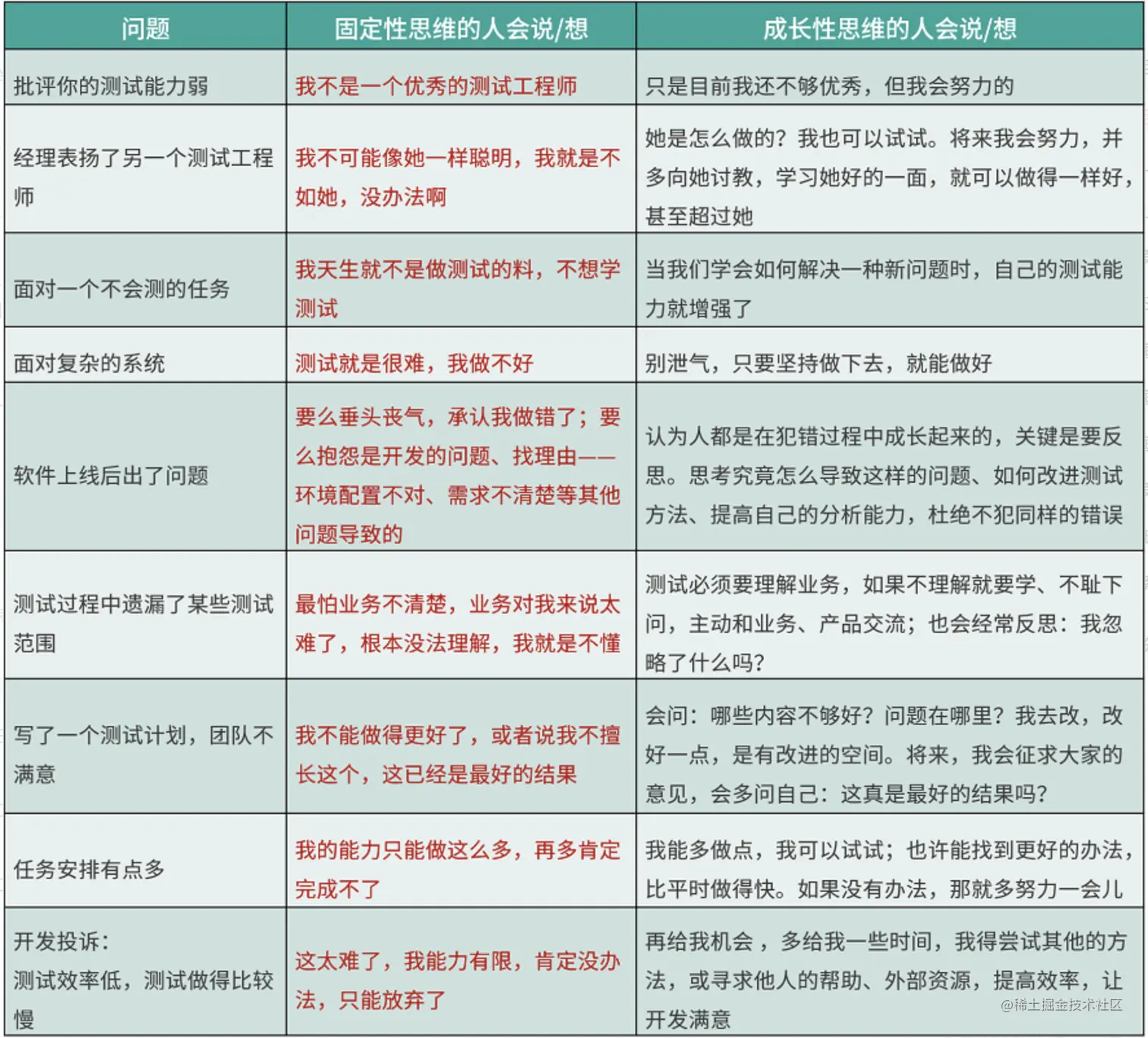 拥有成长性思维的测试工程师和拥有固定性思维的测试工程师的对比