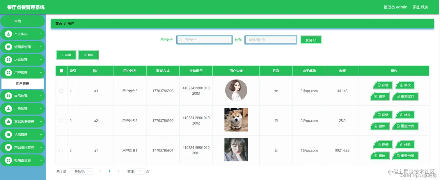 insert into `yonghu`(`id`,`username`,`password`,`yonghu_name`,`yonghu_phone`,`yonghu_id_number`,`yonghu_photo`,`sex_types`,`yonghu_email`,`new_money`,`create_time`) values (1,'a1','123456','用户姓名1','17703786901','410224199010102001','upload/yonghu1.jpg',2,'1@qq.com','99505.10','2023-04-04 11:15:53'),(2,'a2','123456','用户姓名2','17703786902','410224199010102002','upload/yonghu2.jpg',1,'2@qq.com','25.20','2023-04-04 11:15:53'),(3,'a3','123456','用户姓名3','17703786903','410224199010102003','upload/yonghu3.jpg',2,'3@qq.com','441.43','2023-04-04 11:15:53');