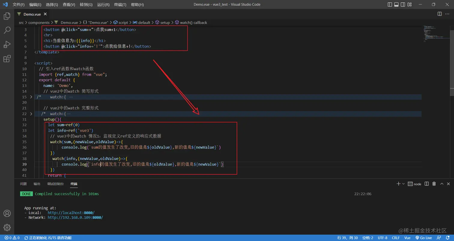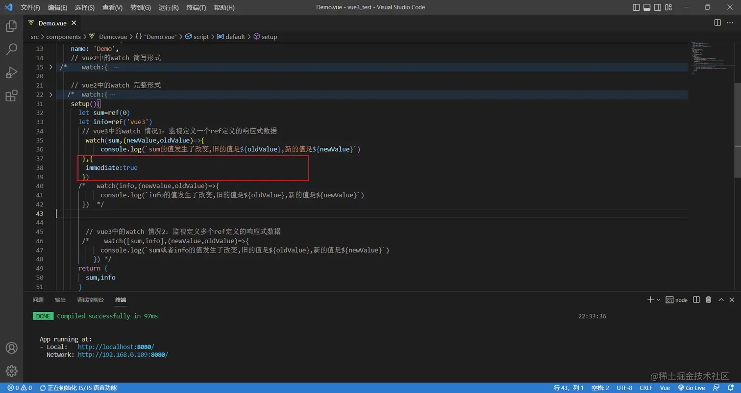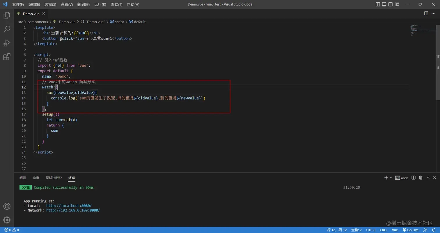 引入完成之后就可以使用了,在vue3中使用watch十分简单,但是有一些不同的使用场景和坑,下面说明