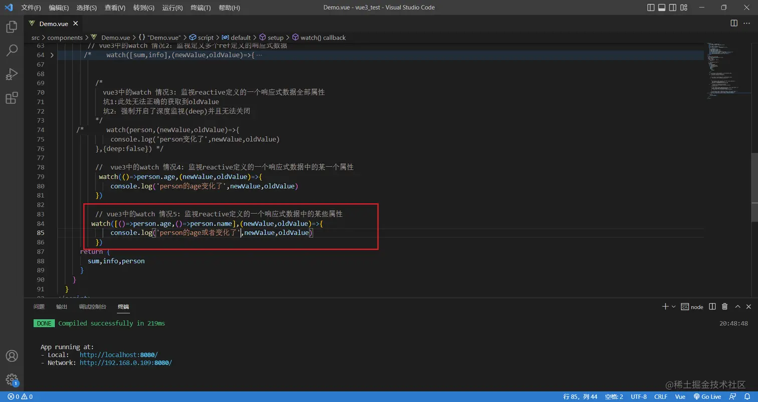 这也是vue3和vue2的差距,在vue2中怎么可能写多个watch呢,只能写一个watch配置项,但是在vue3中就可以写多个watch函数