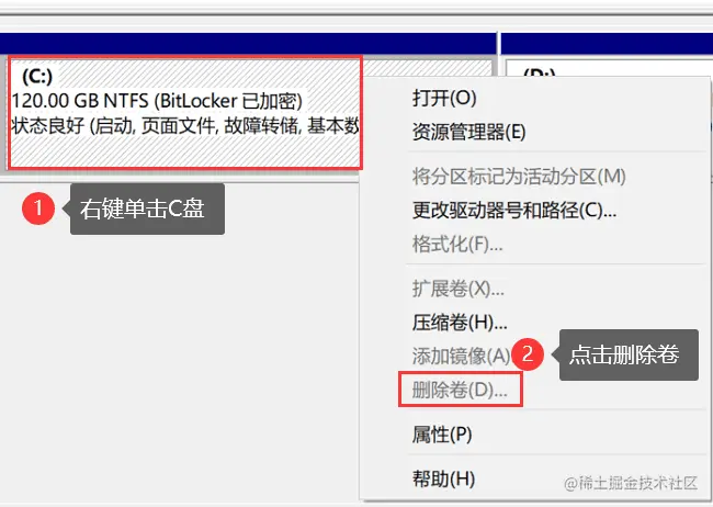 - 在磁盘管理窗口中,找到C盘,右键单击它并选择 【删除卷】 ;