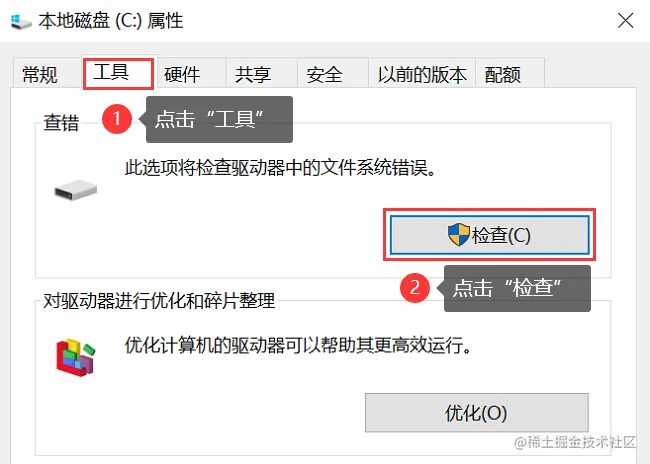 - 单击进入【此电脑】 ,点击c盘【属性】后点击 【工具】 ;