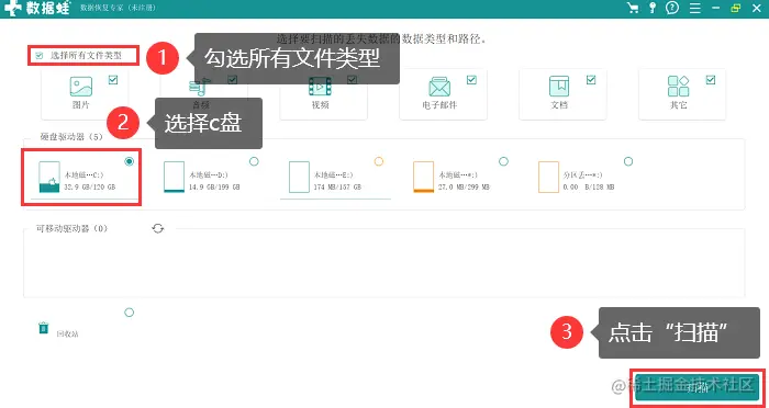 - 由于c盘所存储的文件类型多样,可以勾选所有类型的文件以获得更全面的扫描结果,并勾选扫描磁盘为c盘,点击 【扫描】 ;