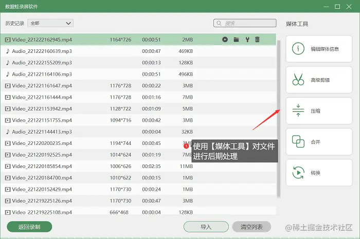 除了可以很好地录制电脑屏幕之外,软件拥有强大的电脑录屏功能,您可以使用【录制历史】页面的【媒体工具】对软件进行压缩、合并、格式转换等后期处理。