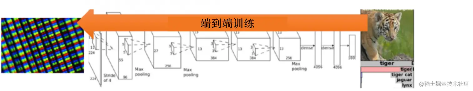 2012年,Krizhevsky等人提出了AlexNet,AlexNet在ImageNet分类比赛中取得冠军,迅速引起了人们对于卷积神经网络的广泛关注。 大家就把特征提取以及分类两者合到一块儿去了,就是训练一个神经网络。这个神经网络既可以做特征提取,也可以做分类,它可以实现端到端训练,如图 1.9b 所示,它的参数可以在每一个阶段都得到极大的优化,这是一个非常重要的突破。