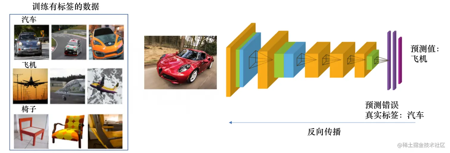 我们可以把强化学习与监督学习做一个对比。以图片分类为例,如图 1.2 所示,监督学习(supervised learning) 假设我们有大量被标注的数据,比如汽车、飞机、椅子这些被标注的图片,这些图片都要满足独立同分布,即它们之间是没有关联关系的。假设我们训练一个分类器,比如神经网络。为了分辨输入的 图片中是汽车还是飞机,在训练过程中,需要把正确的标签信息传递给神经网络。 当神经网络做出错误的预测时,比如输入汽车的图片,它预测出来是飞机,我们就会直接告诉它,该预测是错误的,正确的标签应该是汽车。最后我们根据类似错误写出一个损失函数(loss function),通过反向传播(back propagation)来训练神经网络。