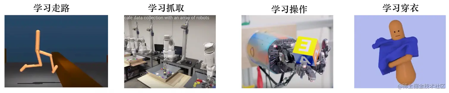(4)穿衣服的智能体。很多时候我们要在电影或者一些动画中实现人穿衣服的场景,通过手写执行命 令让机器人穿衣服非常困难,穿衣服也是一种非常精细的操作。我们可以训练强化学习智能体来实现穿衣 服功能。我们还可以在里面加入一些扰动,智能体可以抵抗扰动。可能会有失败的情况(failure case)出 现,这样智能体就穿不进去衣服。