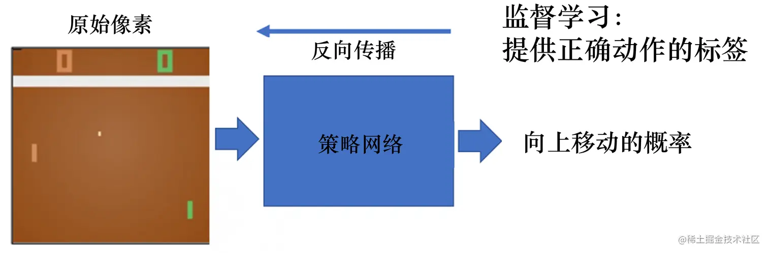 在 Pong 游戏里面,其实只有两个动作:往上或者往下。如图 1.6 所示,如果强化学习通过学习一个策略网络来进行分类,那么策略网络会输入当前帧的图片,输出所有决策的可能性,比如往上移动的概率。