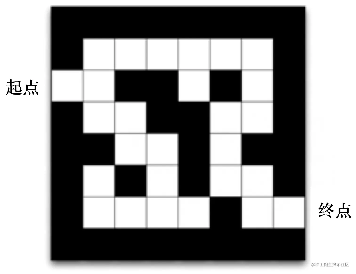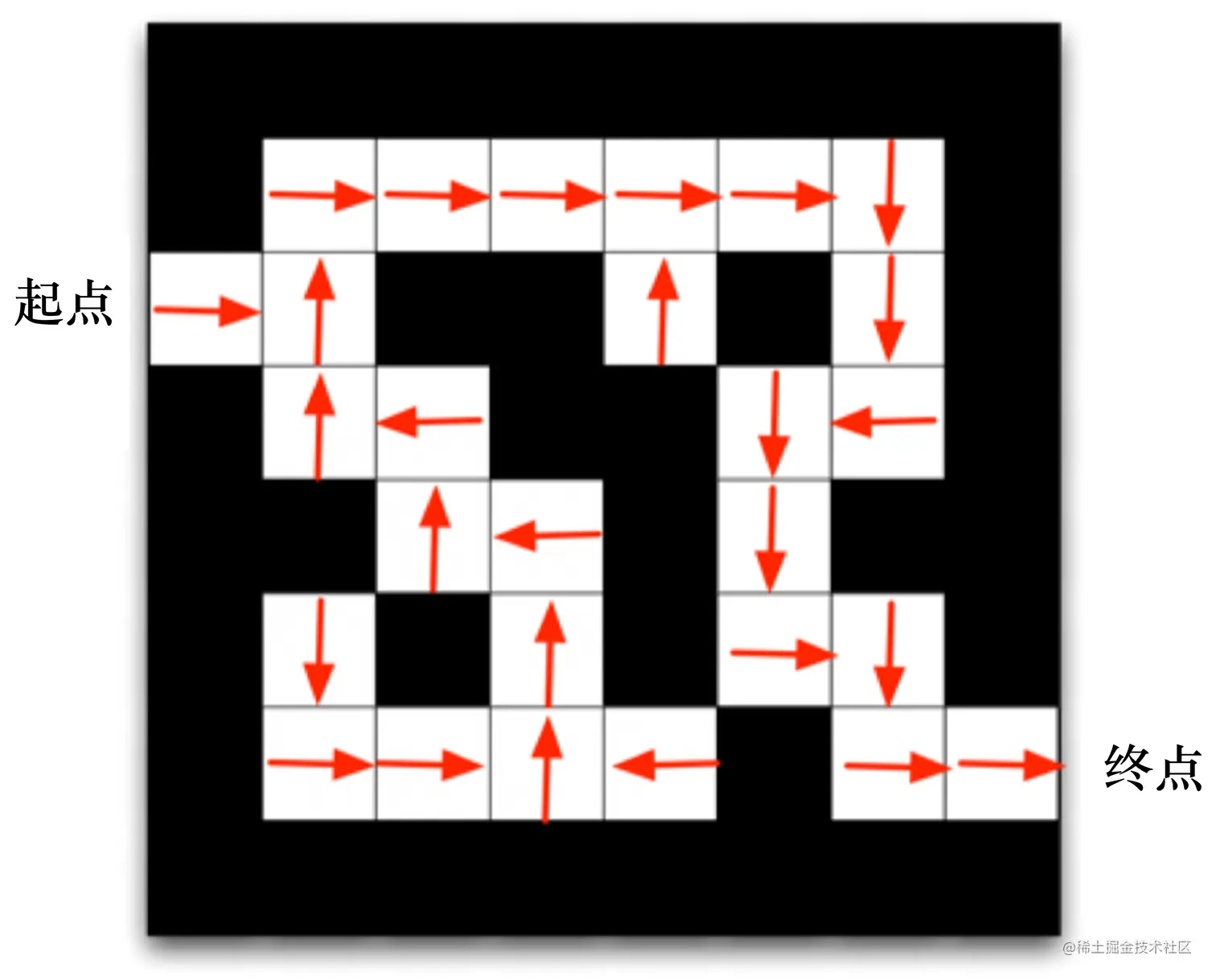 我们可以用不同的强化学习方法来解这个环境。 如果我们采取基于策略的强化学习(policy-based RL)方法,当学习好了这个环境后,在每一个状态,我们都会得到一个最佳的动作。如图 1.17 所示,比如我们现在在起点位置,我们知道最佳动作是往右走;在第二格的时候,得到的最佳动作是往上走;第三格是往右走......通过最佳的策略,我们可以最快地到达终点。