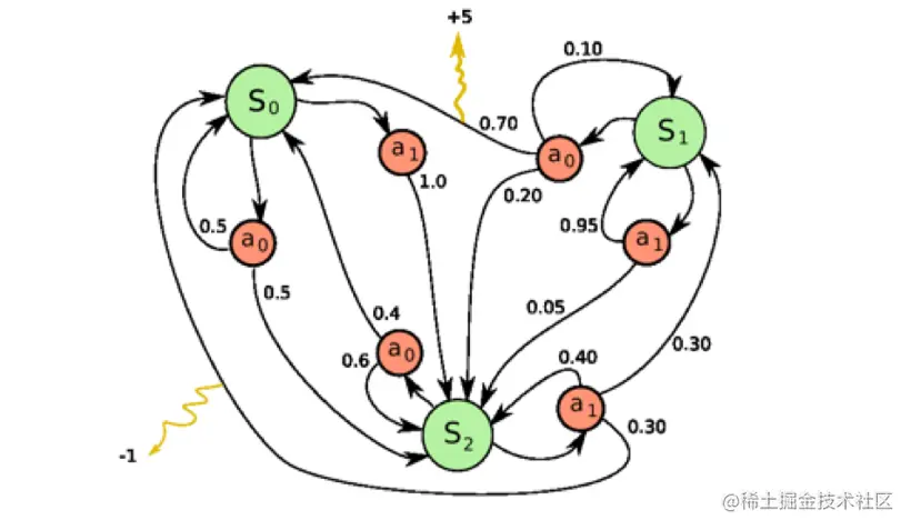 当我们有了策略、价值函数和模型3个组成部分后,就形成了一个马尔可夫决策过程(Markov decision process)。如图 1.15 所示,这个决策过程可视化了状态之间的转移以及采取的动作。