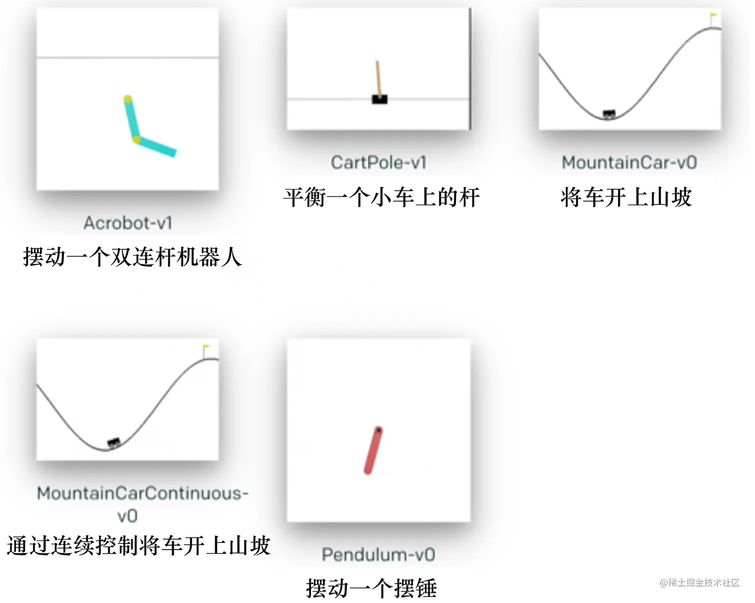 接下来,我们通过一个例子来学习如何与 Gym 库进行交互。我们选取小车上山(MountainCar-v0) 作为例子。