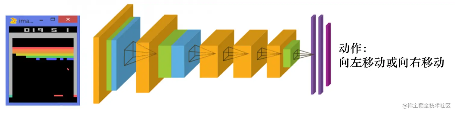 如图 1.14 所示,从雅达利游戏来看,策略函数的输入就是游戏的一帧,它的输出决定智能体向左移动或者向右移动。