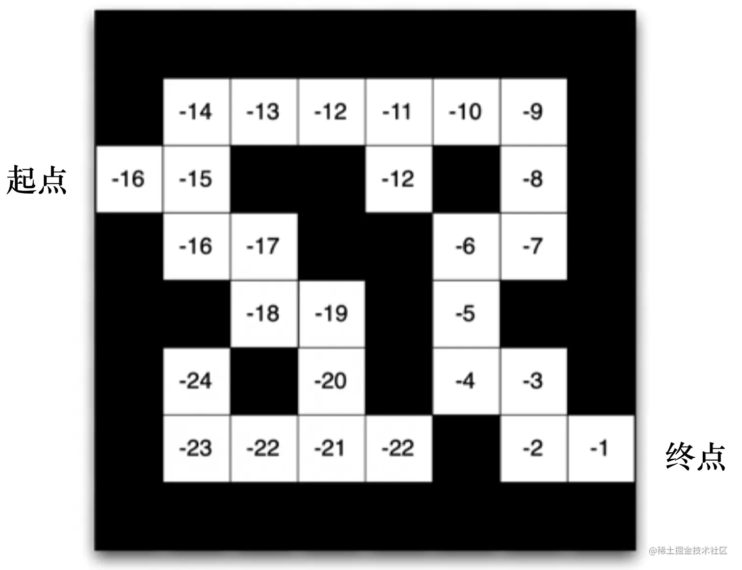 如果换成基于价值的强化学习(value-based RL)方法,利用价值函数作为导向,我们就会得到另外一种表征,每一个状态会返回一个价值。如图 1.18 所示,比如我们在起点位置的时候,价值是-16,因为我们最快可以 16 步到达终点。因为每走一步会减1,所以这里的价值是 -16。 当我们快接近终点的时候,这个数字变得越来越大。在拐角的时候,比如现在在第二格,价值是-15,智能体会看上、下两格,它看到上面格子的价值变大了,变成 -14 了,下面格子的价值是 -16,那么智能体就会采取一个往上走的动作。所以通过学习的价值的不同,我们可以抽取出现在最佳的策略。