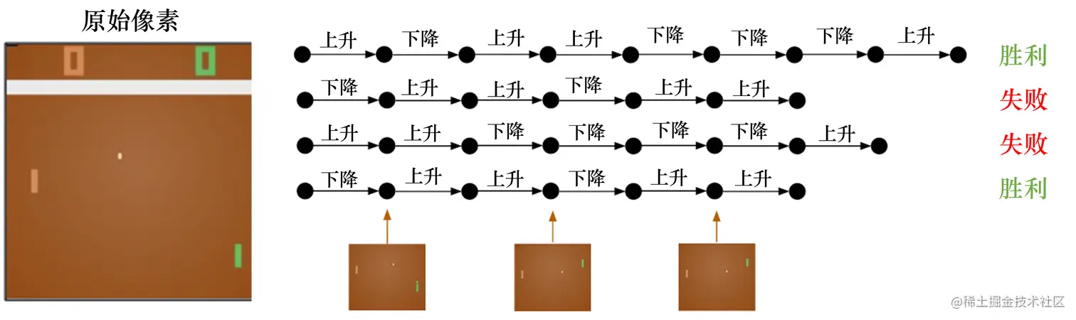 在强化学习里面,我们让智能体尝试玩 Pong 游戏,对动作进行采样,直到游戏结束,然后对每个动作 进行惩罚。图 1.8 所示为预演(rollout)的一个过程。预演是指我们从当前帧对动作进行采样,生成很多 局游戏。我们将当前的智能体与环境交互,会得到一系列观测。每一个观测可看成一个轨迹(trajectory)。 轨迹就是当前帧以及它采取的策略,即状态和动作的序列: