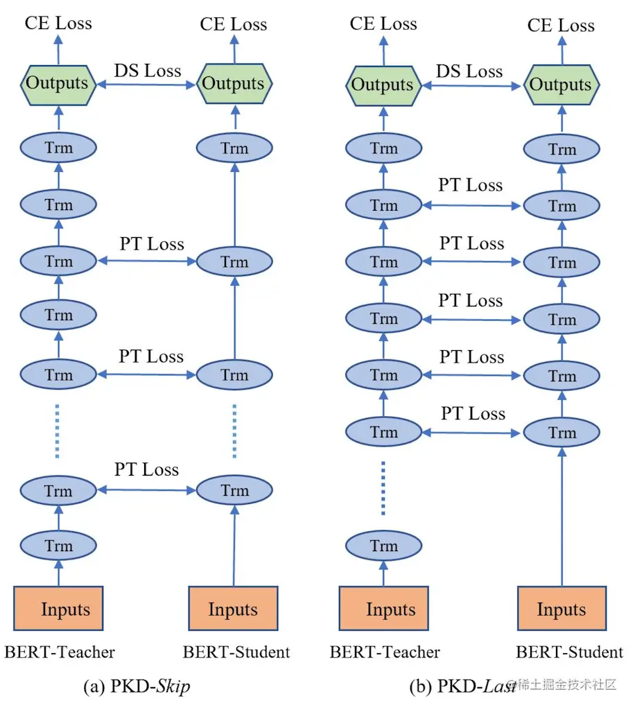 图2a: PKD-Skip 学生网络学习教师网络每两层的输出 图2b: PKD-Last 学生网络从教师网络的最后六层学习