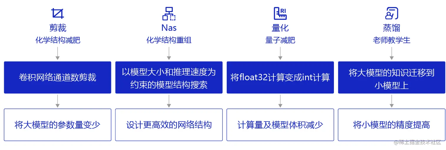 - 量化:类似“量子级别的减肥”,神经网络模型的参数一般都用float32的数据表示,但如果我们将float32的数据计算精度变成int8的计算精度,则可以牺牲一点模型精度来换取更快的计算速度。