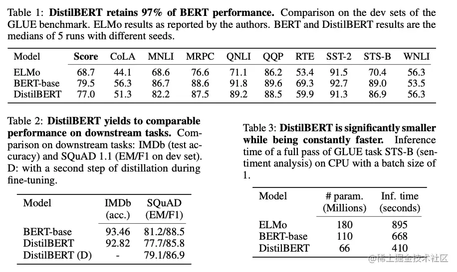 根据上图我们可以看到,DistilBERT与BERT相比减少了40%的参数,同时保留了BERT 97%的性能,但提高了60%的速度。