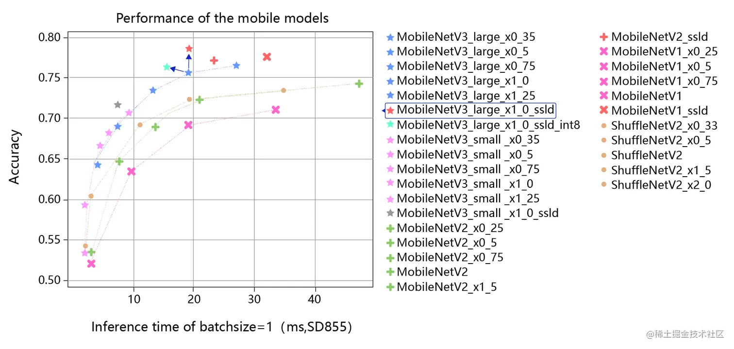 上图是分类模型使用了蒸馏和量化的效果图,横轴是推理耗时,纵轴是模型准确率。 图中最上边红色的星星对应的是在MobileNetV3_large model基础上,使用蒸馏后的效果,相比它正下方的蓝色星星,精度有明显的提升。 图中所标浅蓝色的星星,对应的是在MobileNetV3_large model基础上,使用了蒸馏和量化的结果,相比原始模型,精度和推理速度都有明显的提升。 可以看出,在人工设计的经典小模型基础上,经过蒸馏和量化可以进一步提升模型的精度和推理速度。