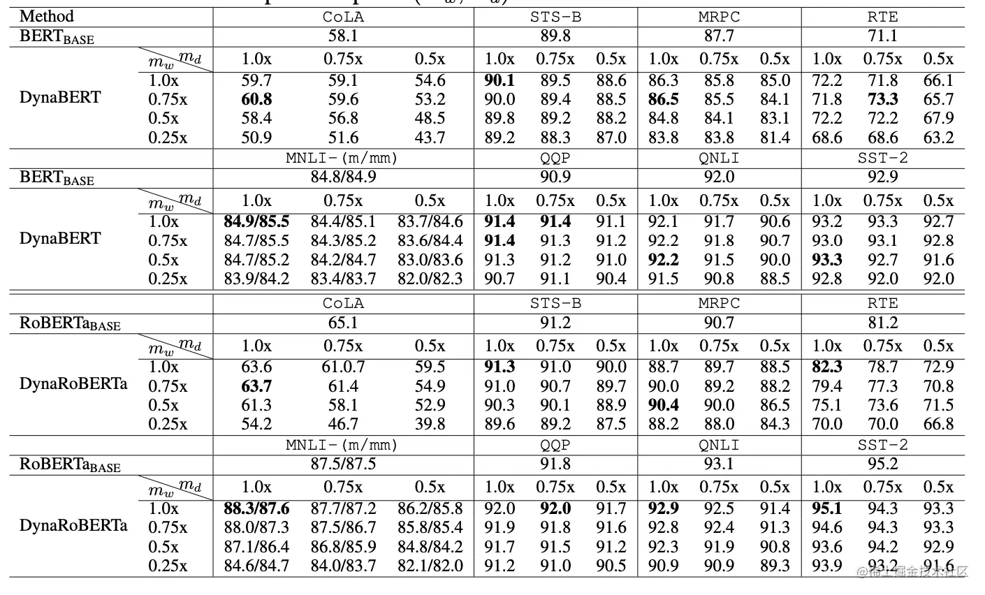 根据不同的宽度和深度剪裁系数,作者最终得到12个大小不同的DyneBERT模型,其在GLUE上的效果如下: